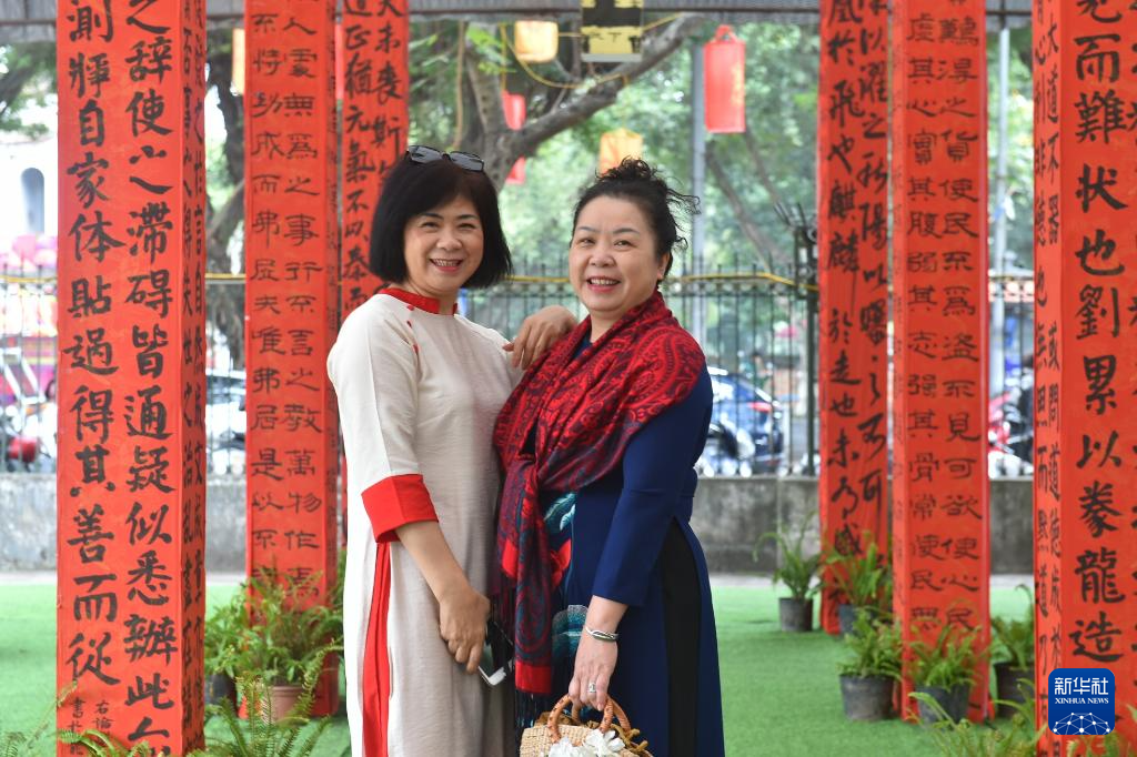 2月4日,在越南河内的文庙-国子监,两名越南女青年在汉字书法作品展示区拍照。