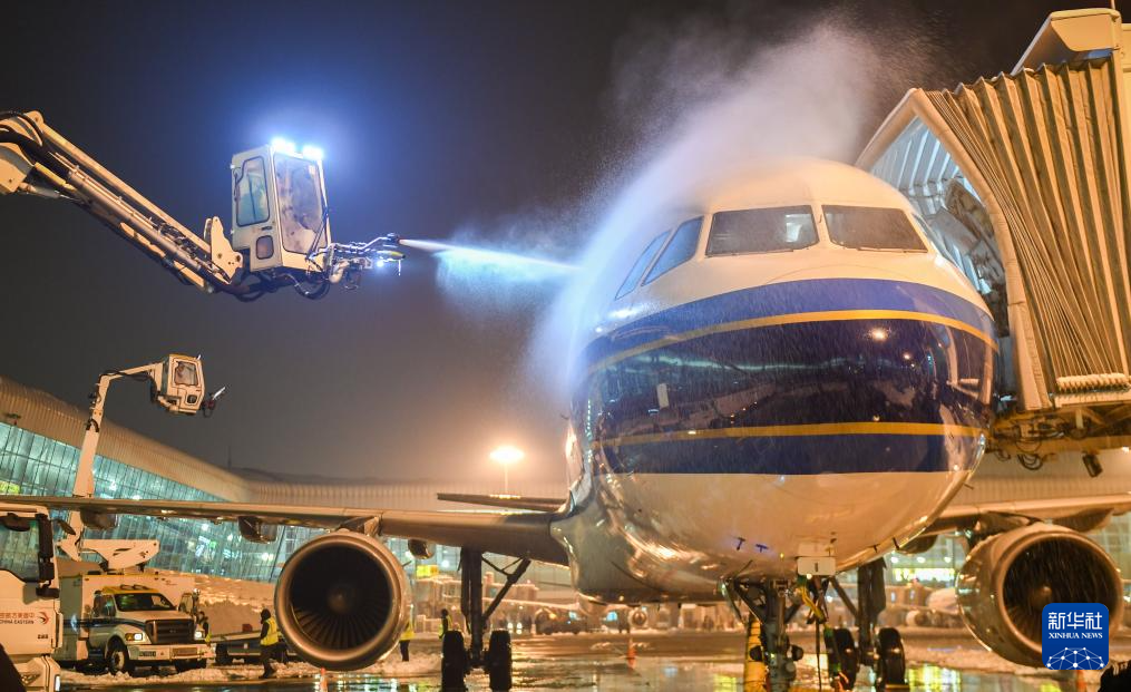 2月5日夜,工作人员在武汉天河国际机场对飞机进行除冰除雪作业。