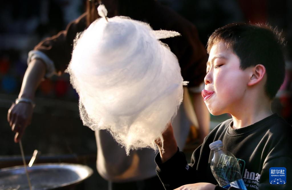 2月12日,小朋友在广东省佛山市顺德区杏坛镇街头吃棉花糖。