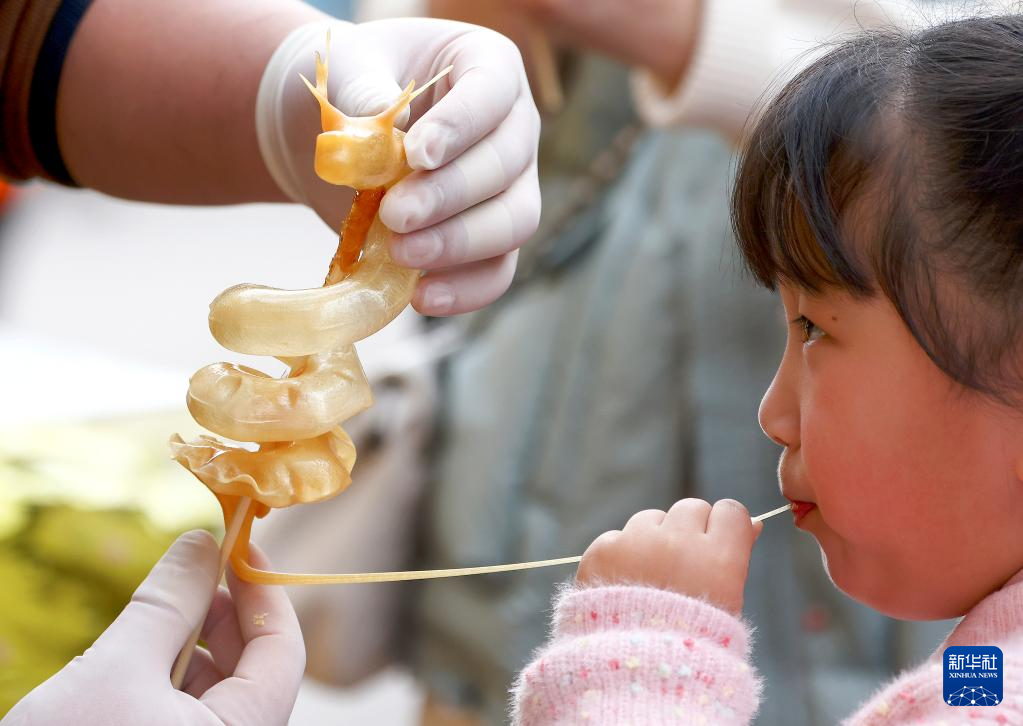 2月13日,小朋友在南京市溧水区无想水镇景区体验吹糖人。