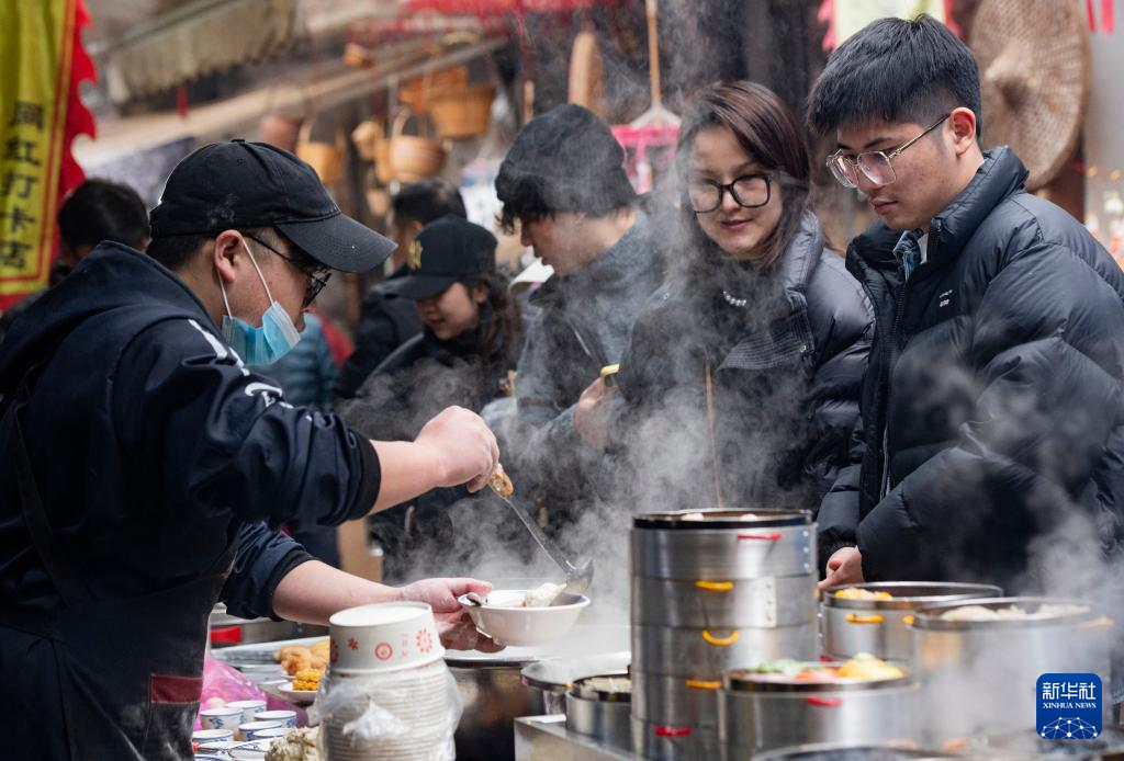 2月14日,游客在山东省临沂市郯城县马头镇小吃一条街品尝特色美食。