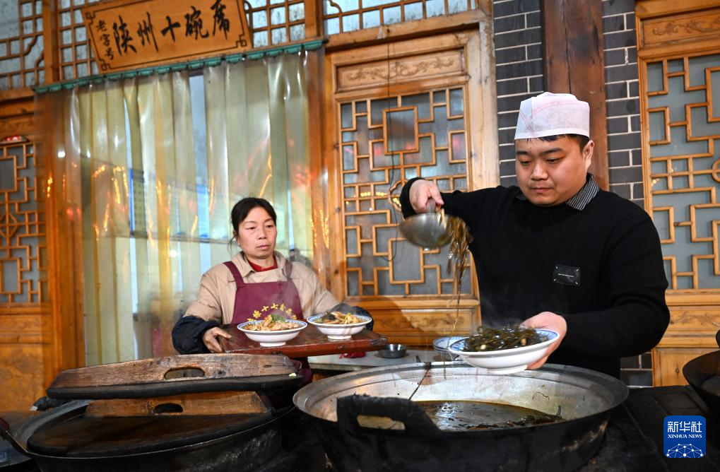 2月14日,湖北省襄阳市古城管家巷文化休闲街区的商家为顾客准备特色蒸菜。