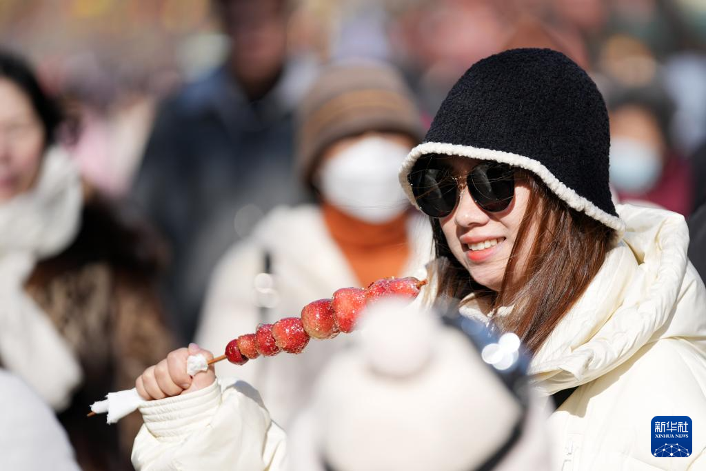 2月12日,游客在哈尔滨百年老街中央大街品尝草莓冰糖葫芦。