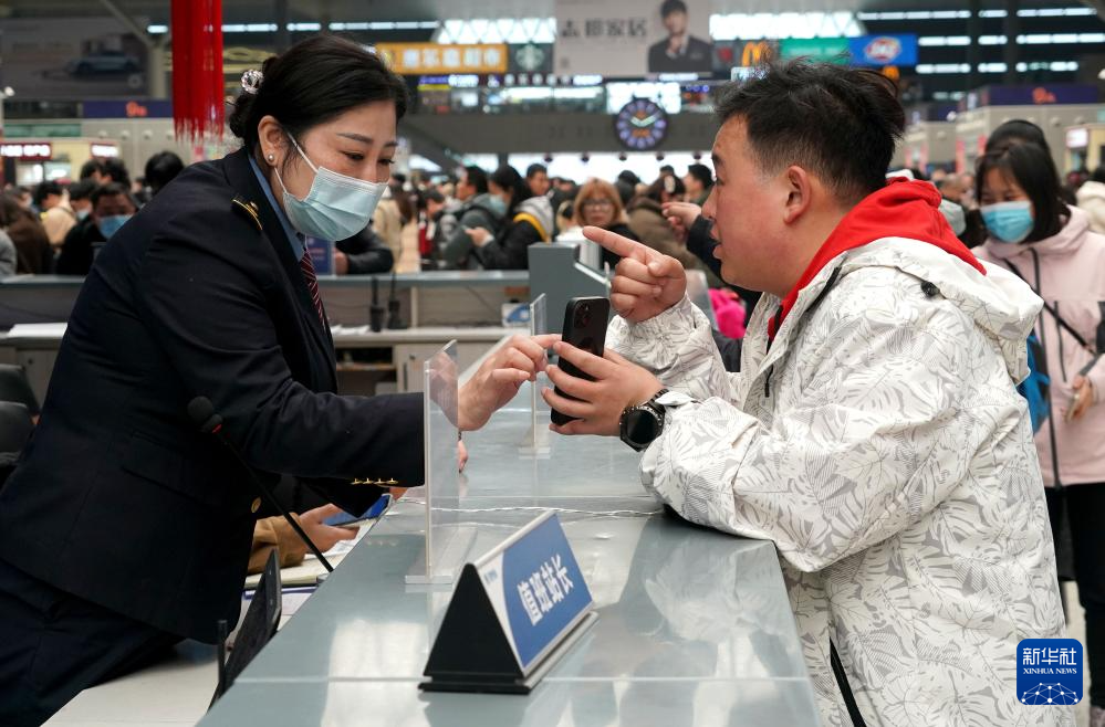 2月17日,在郑州东站候车大厅,铁路工作人员在解答旅客疑问。