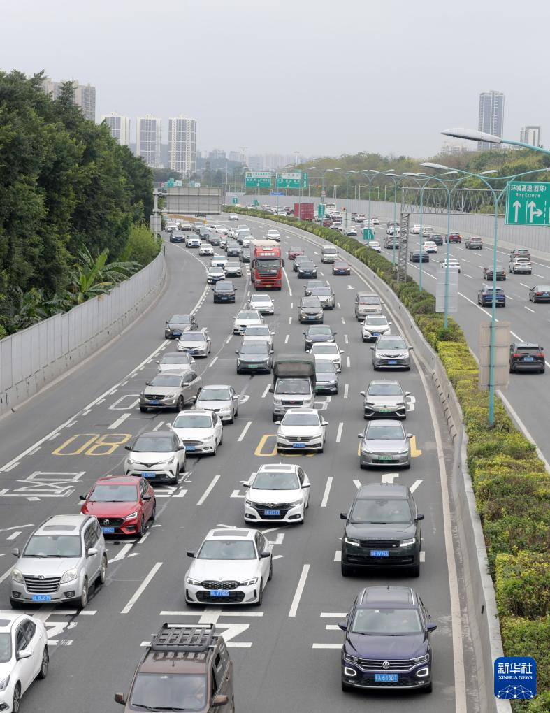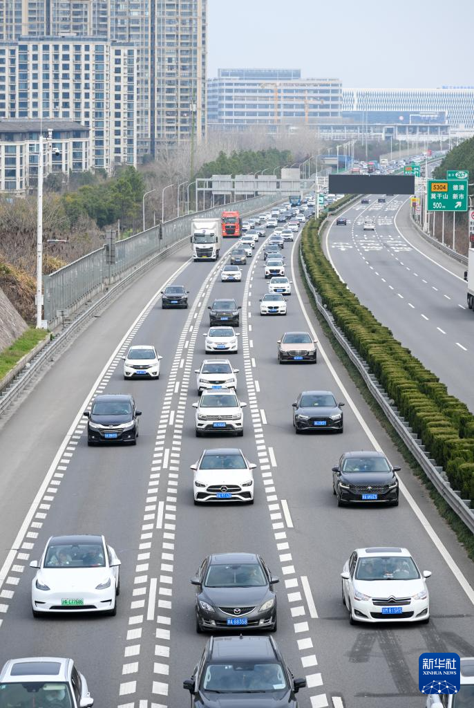2月17日,浙江省湖州市杭宁高速德清段杭州方向,车辆在高速公路上缓慢行驶。