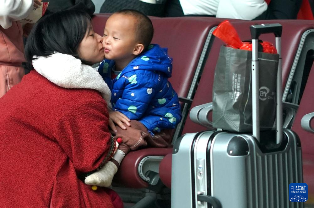 2月17日,在石家庄火车站候车大厅,一位母亲在亲吻自己的孩子。