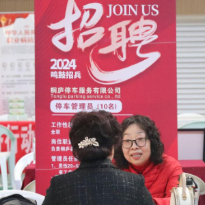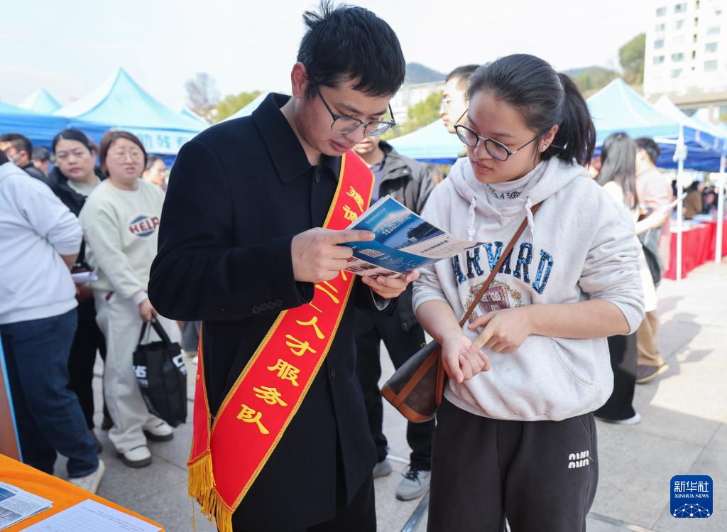 2月19日,在浙江省建德市“新春纳才 遇建未来”2024年新春首场综合性招聘会现场,志愿者给求职者介绍就业政策。