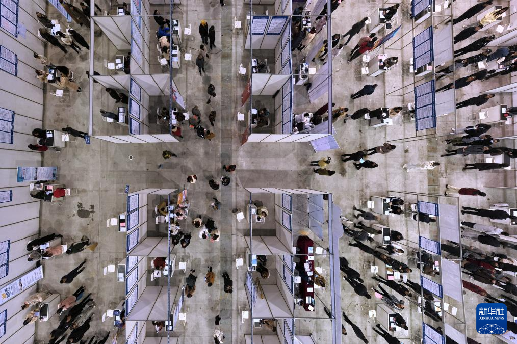 2月19日,求职者在江苏省扬州市举办的新春招聘会上寻找适合的岗位(无人机照片)。