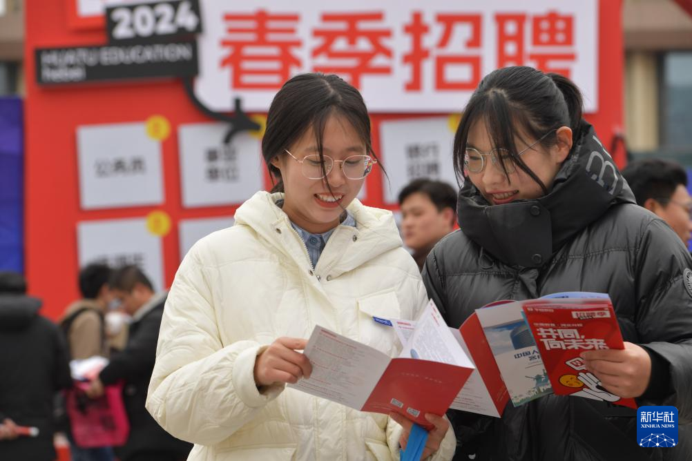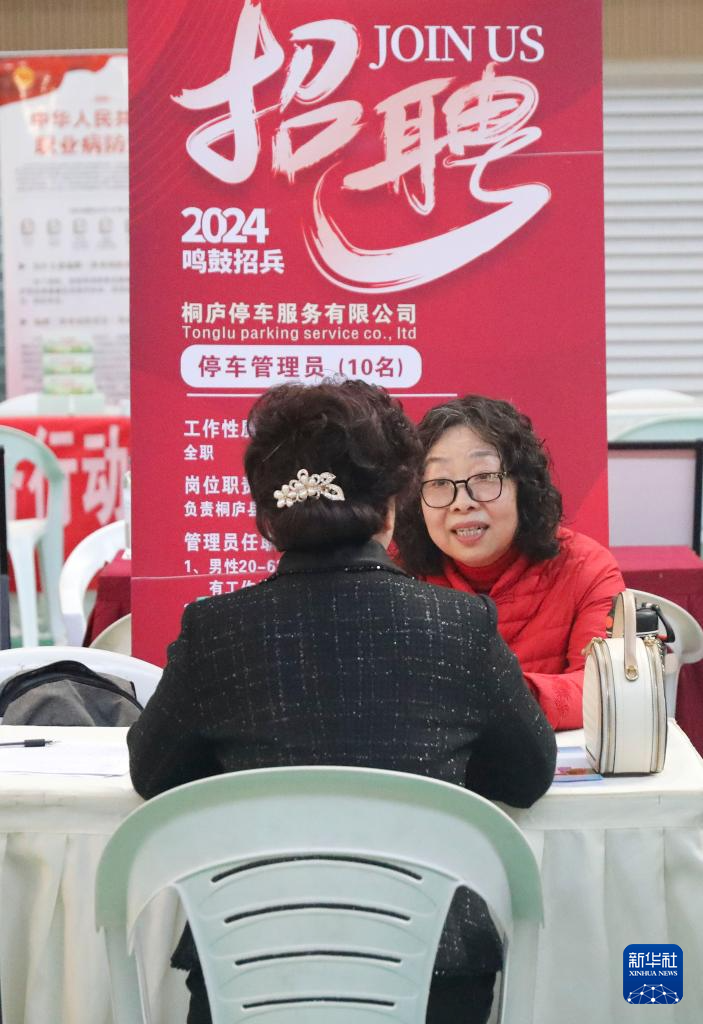2月19日,求职者在安徽省滁州市来安县举办的2024年春风行动暨企业用工人才招聘会现场了解岗位信息。