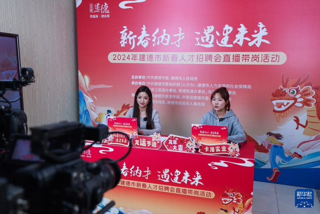 2月19日,在浙江省建德市“新春纳才 遇建未来”2024年新春首场综合性招聘会现场,工作人员进行网上直播带岗。