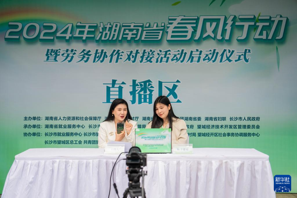2月19日,在湖南省长沙市望城区市民广场,工作人员在“春风行动”招聘活动上通过网络直播推荐工作岗位。