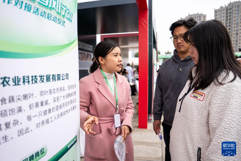 2月19日,在湖南省长沙市望城区市民广场,工作人员(左)在“春风行动”招聘活动上介绍岗位信息。