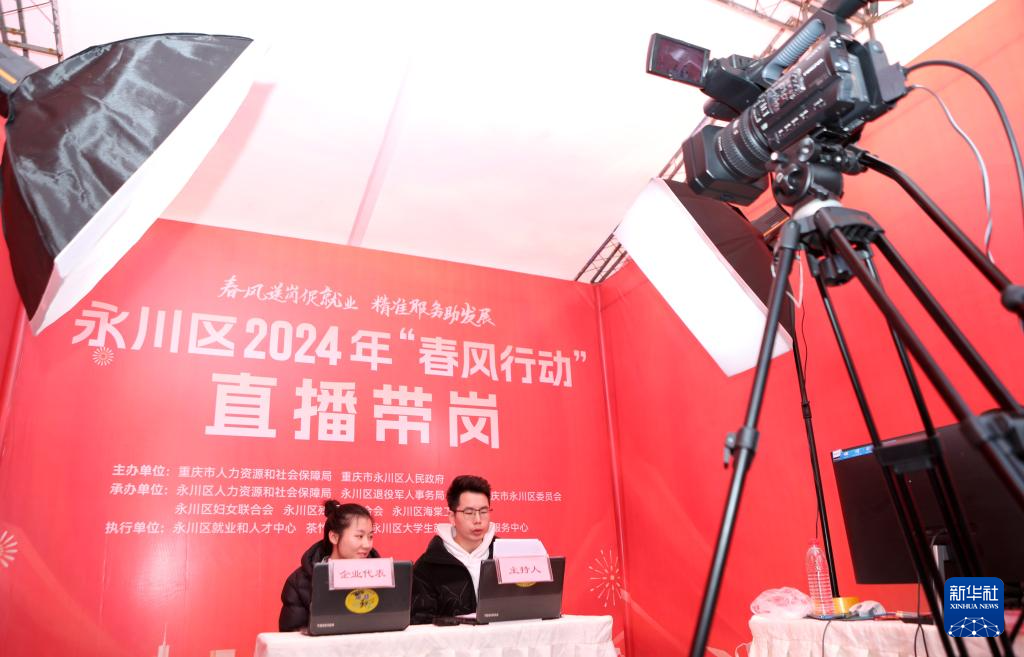 2月19日,工作人员在重庆市永川区2024年“春风行动”大型招聘会上“直播带岗”。