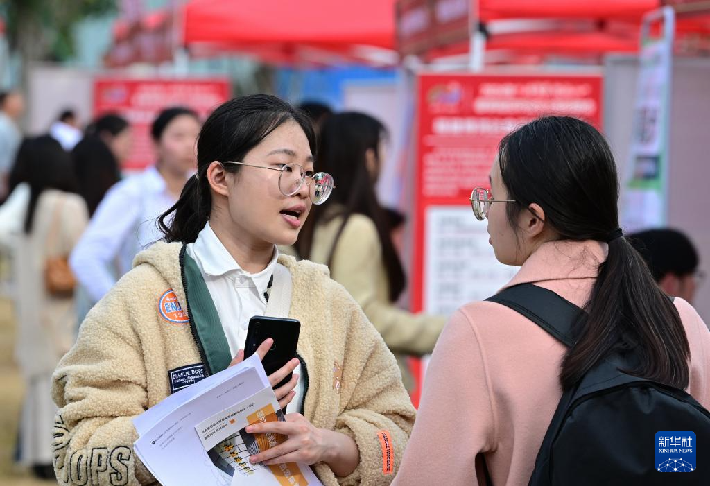 2月19日,求职学生在福建省福州市“好年华 聚福州”2024年春季高校毕业生招聘周启动仪式现场交流。