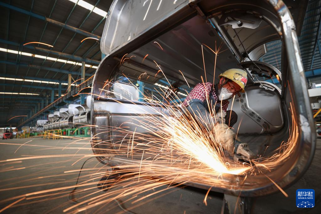 2月20日,工人在贵州省黔东南苗族侗族自治州丹寨县金钟经济开发区一家生产车厢的企业打磨车厢。