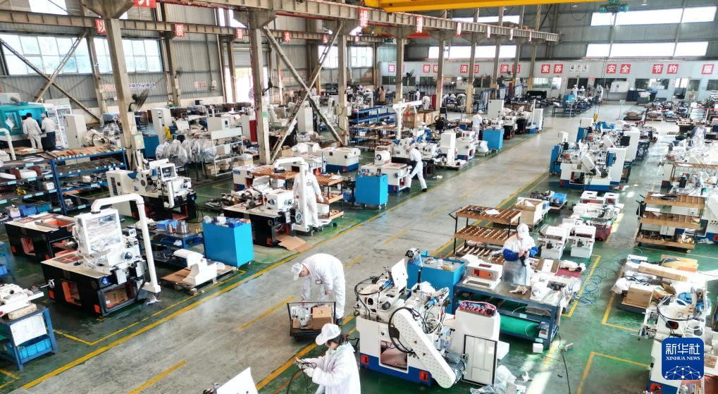 2月20日,工人在贵州省黔东南苗族侗族自治州丹寨县金钟经济开发区一家生产机床的企业车间忙碌(无人机照片)。