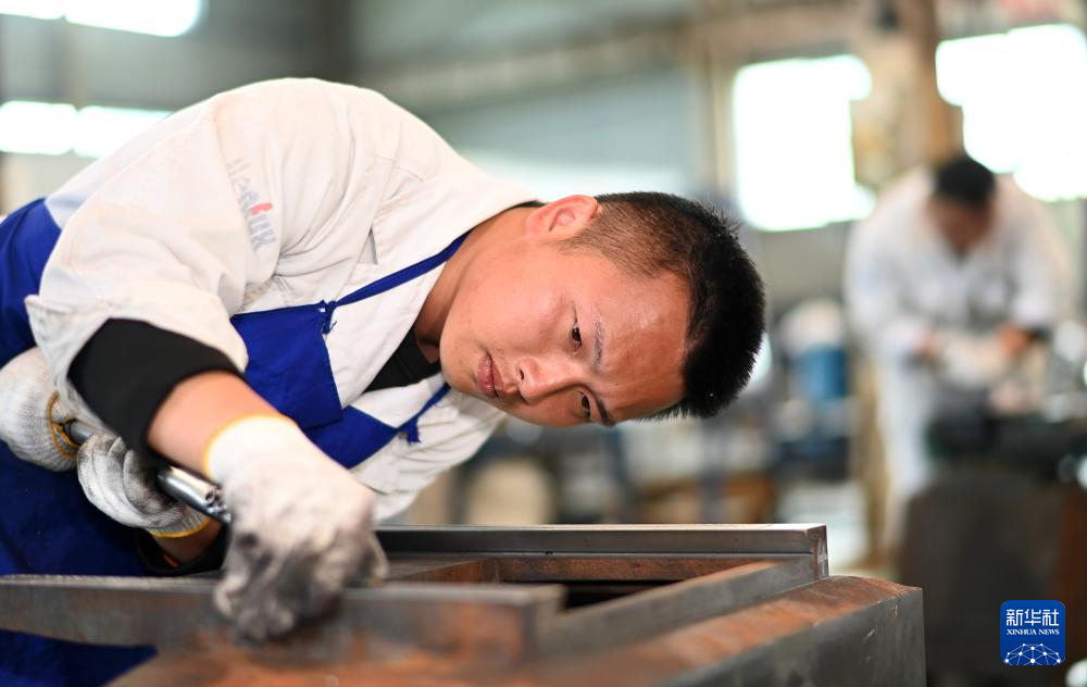 2月20日,工人在贵州省黔东南苗族侗族自治州丹寨县金钟经济开发区一家生产机床的企业进行铲花作业。
