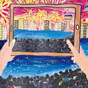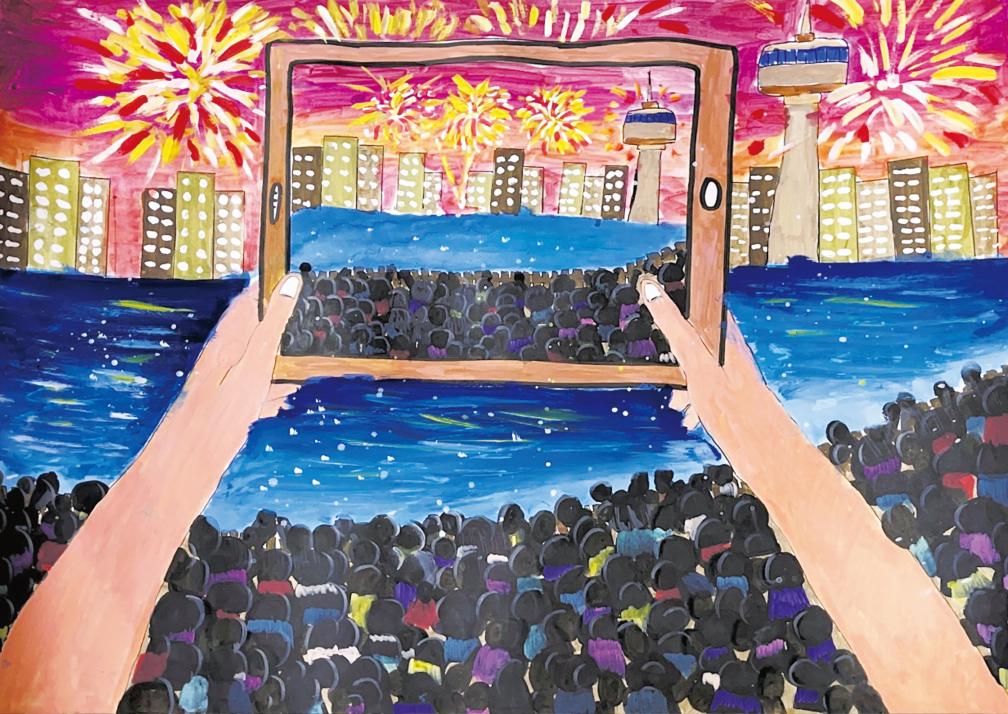 这是第三届“天宫画展”中展出的麦晓楠作品《烟花耀濠江 照亮幸福新生活》。