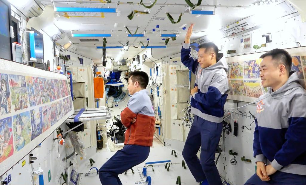 2月23日,神舟十七号航天员乘组在轨展示和介绍第三届“天宫画展”作品(视频截图)。