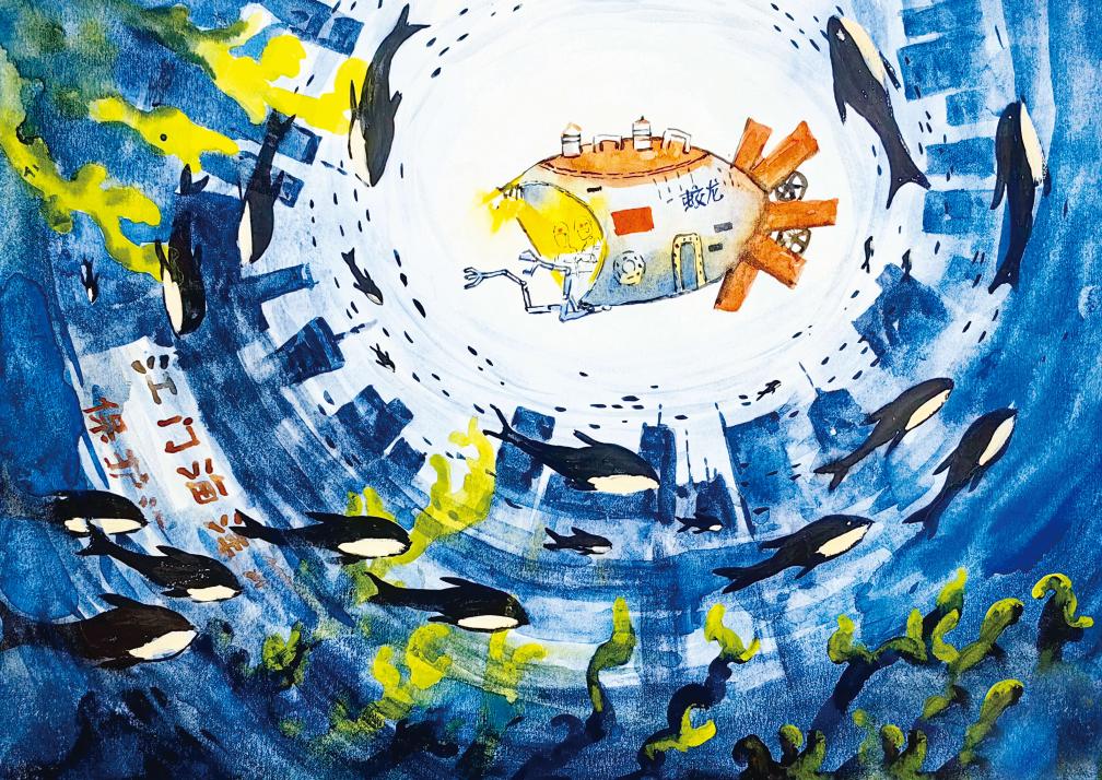 这是第三届“天宫画展”中展出的李慧敏作品《蛟龙探海·保护海洋:大洋深处的“中国梦”》。