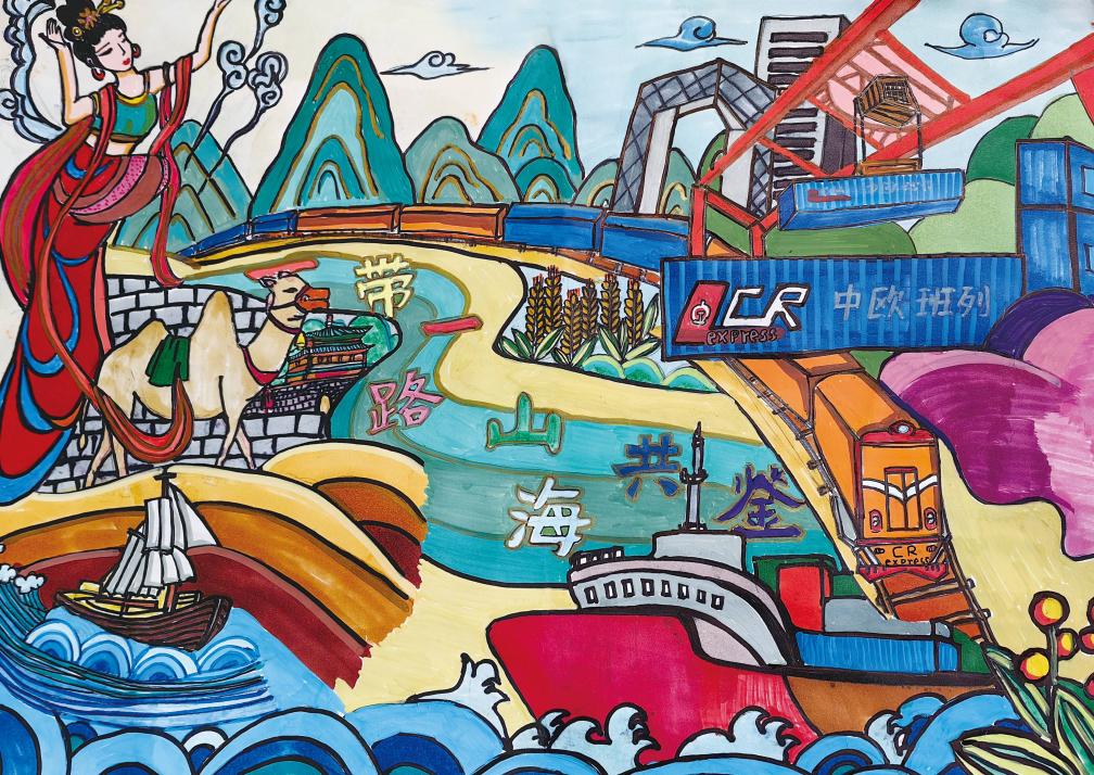 这是第三届“天宫画展”中展出的陈筠溪作品《一带一路 山海共鉴》。