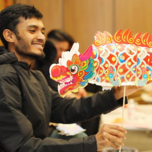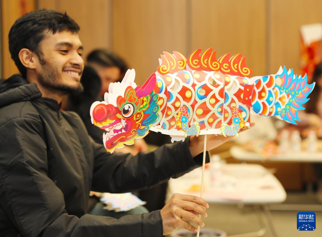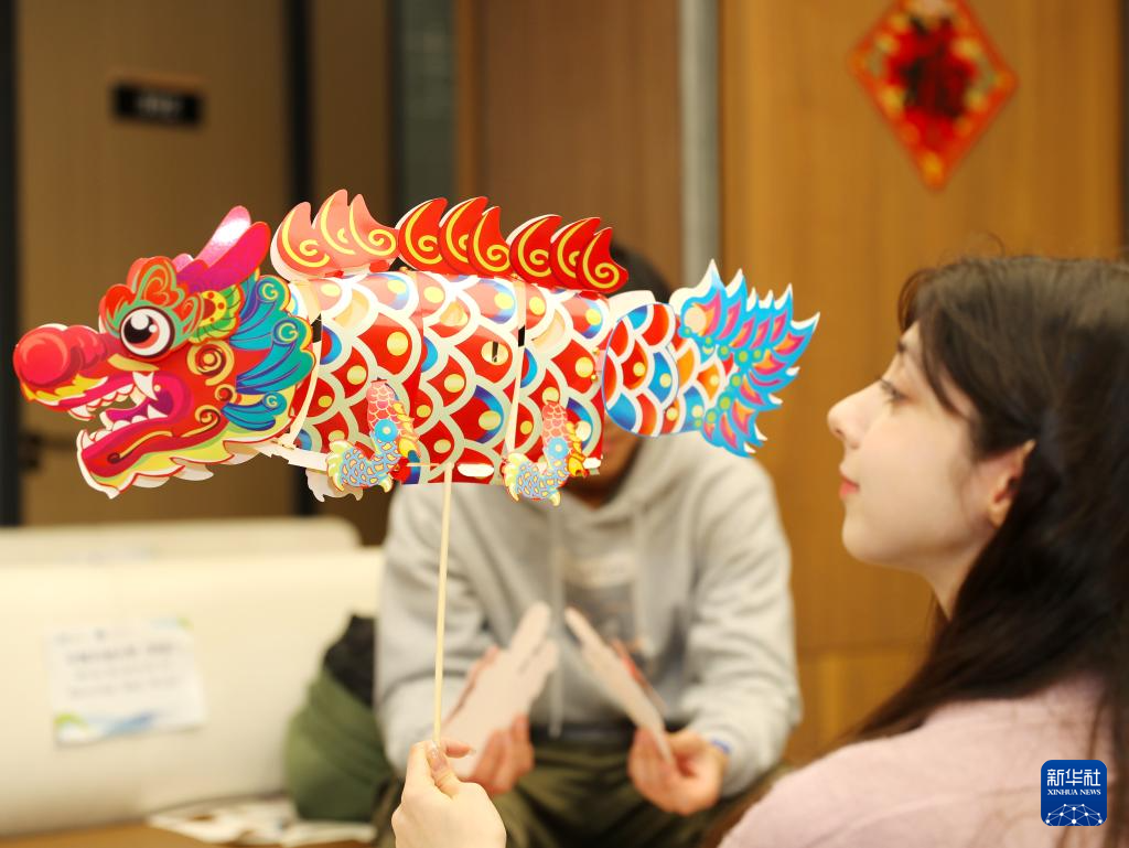 2月23日,在山东自贸试验区青岛片区,外国留学生拼装龙形花灯。