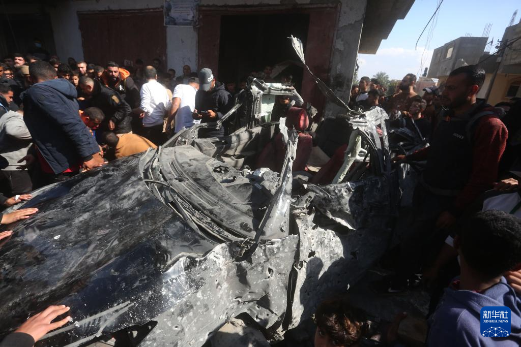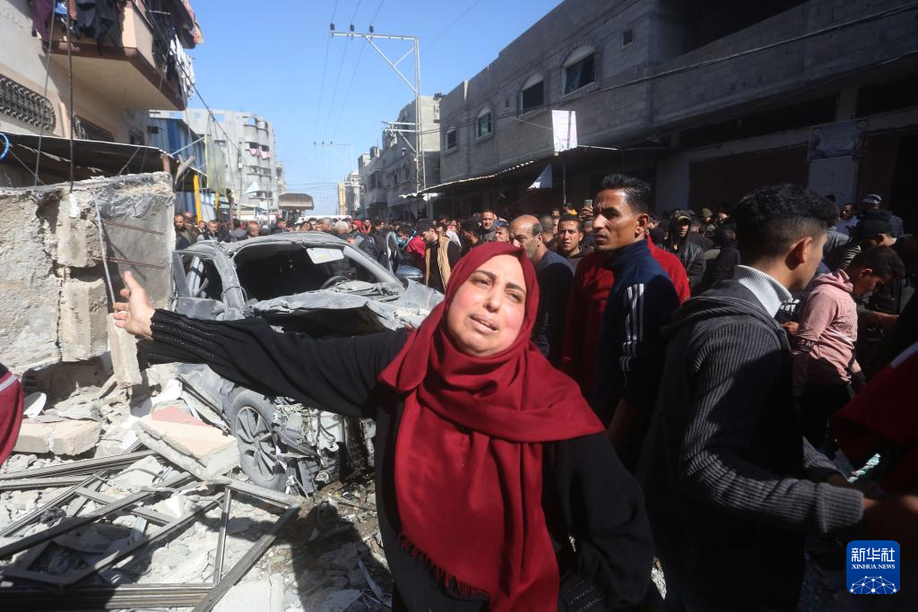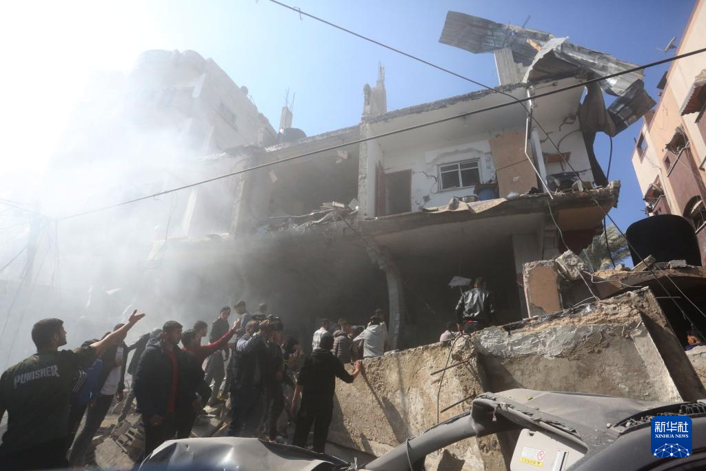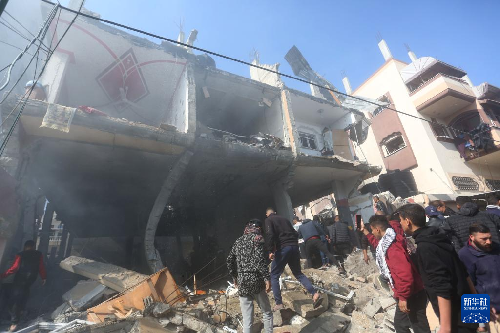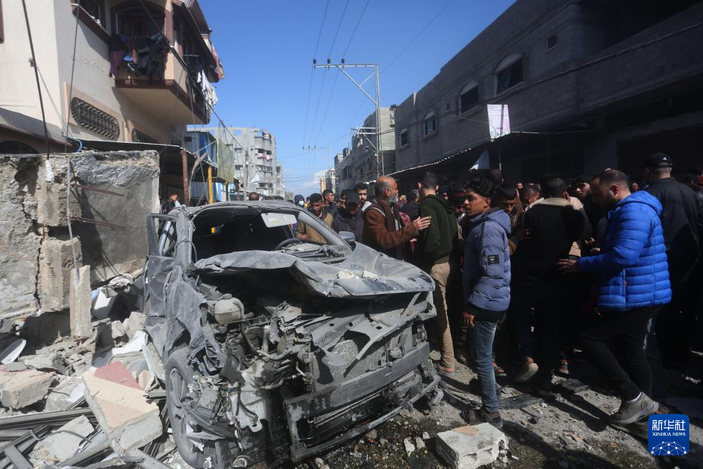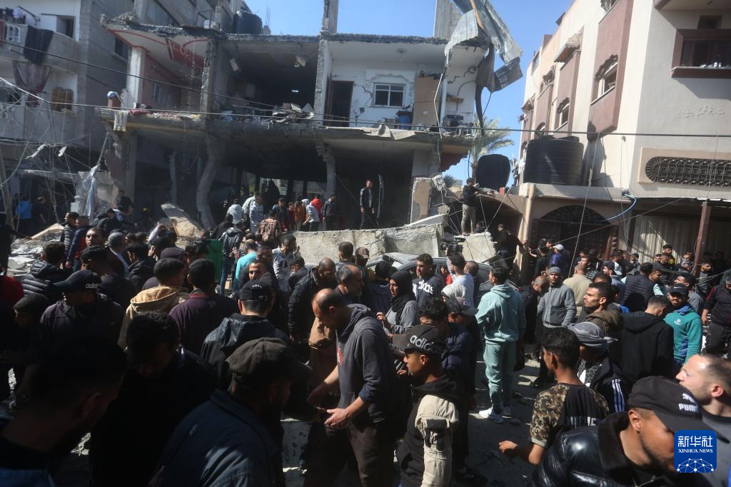 2月24日,在加沙地带南部城市拉法,人们聚集在被以军空袭的建筑前。