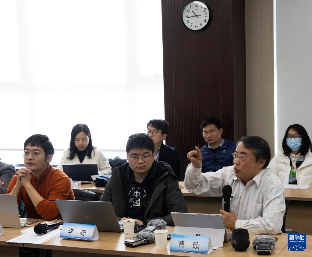 在位于北京的中国科学院高能物理研究所会议室,“拉索”首席科学家、中国科学院高能物理研究所曹臻(前排右一)院士在回答记者提问(2月22日摄)。