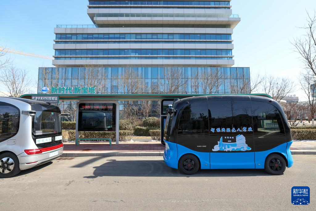 智能网联公交车在京津中关村科技城站停靠(2月22日摄)。