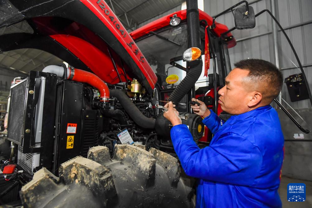 2月27日,在四川省仁寿县珠嘉镇五谷园农业专业合作社,农机服务小分队在检查、维护农机。
