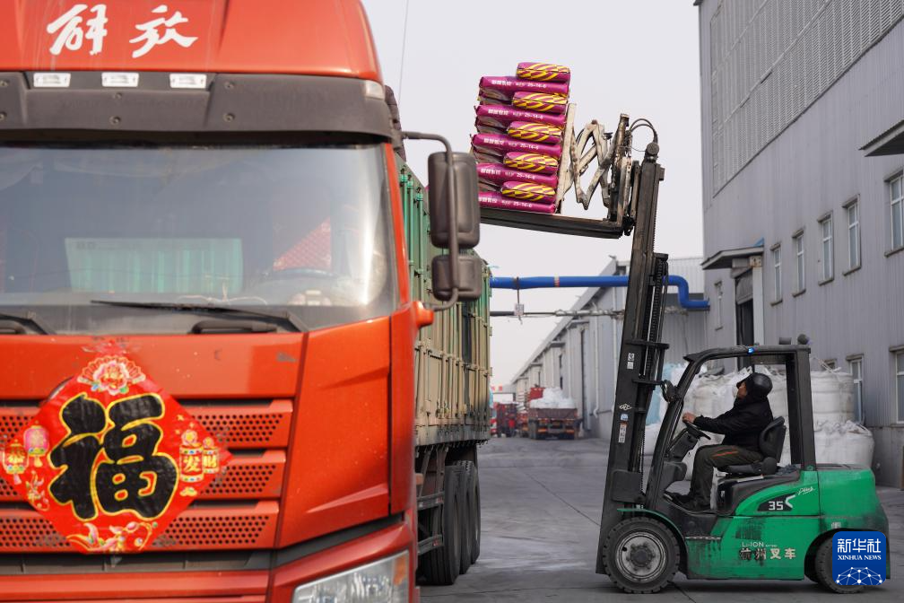 2月27日,在甘肃省定西市一家农机制造企业,工人驾驶叉车转运准备外销的农机。