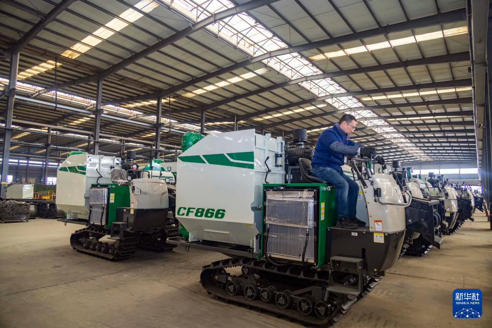 2月27日,在位于江苏省泰州市九龙镇的泰州常发农业装备有限公司生产车间,工人在对收割机进行出厂前的检验调试。