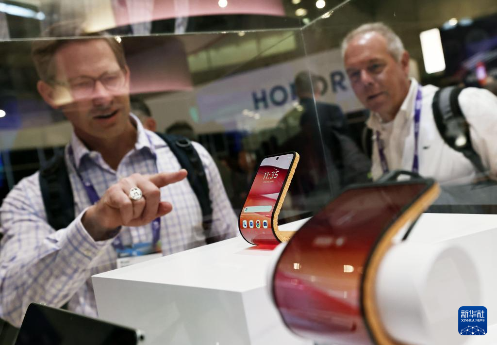2月27日,在西班牙巴塞罗那举行的2024年世界移动通信大会上,人们在联想展台参观摩托罗拉可弯曲智能手机。联想旗下摩托罗拉展示的这款概念性的可弯曲智能手机使用了6.9英寸的可适应屏幕,可随着弯折角度立在桌子上,或像智能手表佩戴在手腕上。
