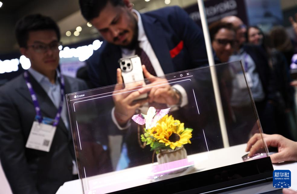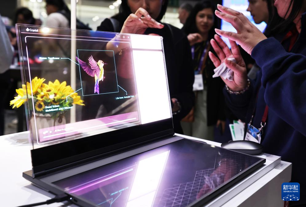 2月26日,在西班牙巴塞罗那举行的2024年世界移动通信大会上,参观者关注联想最新概念产品ThinkBook透明屏笔记本电脑。这款电脑借助人工智能技术将物理对象与数字信息相结合,创造出独特的用户内容,其透明性设计让设备能自然融入周围环境。