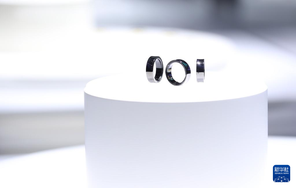 这是2月28日在西班牙巴塞罗那的世界移动通信大会上拍摄的三星智能戒指Galaxy Ring。