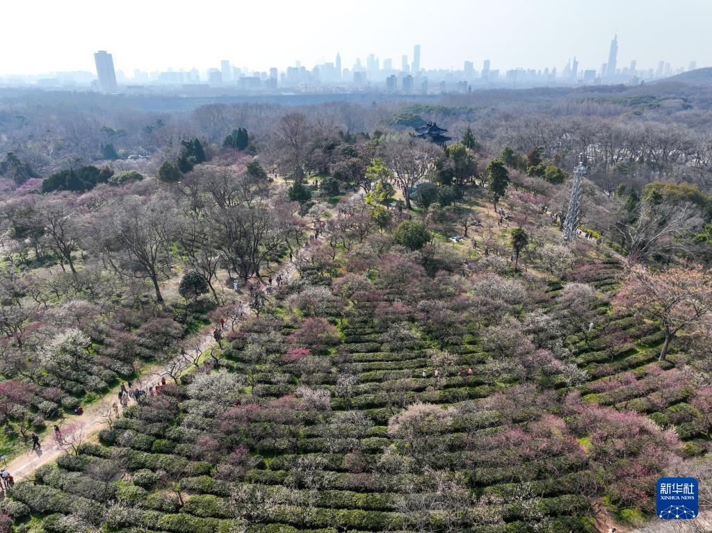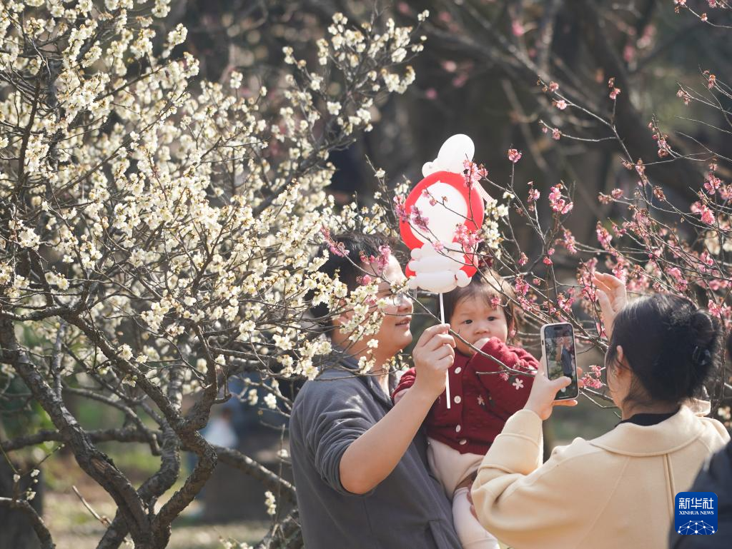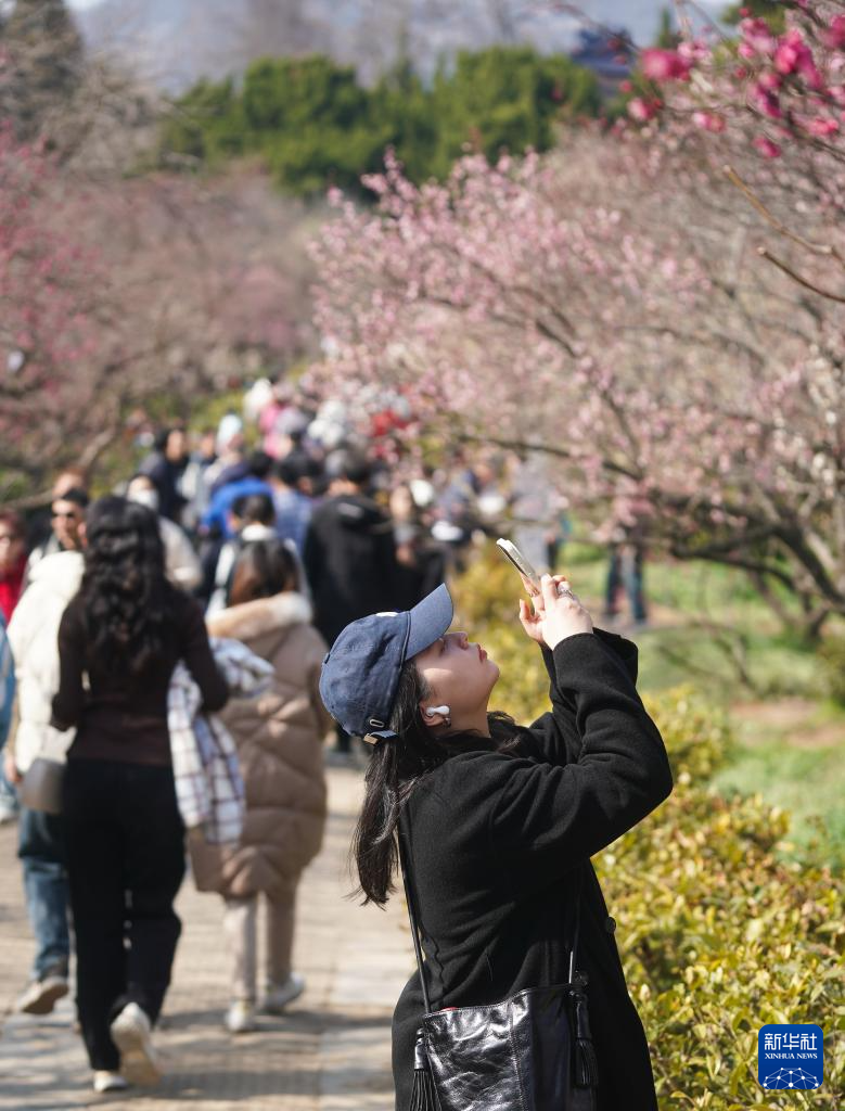 眼下,江苏南京梅花山上各色梅花竞相绽放,吸引游人前来赏花拍照,享受美好春日时光。