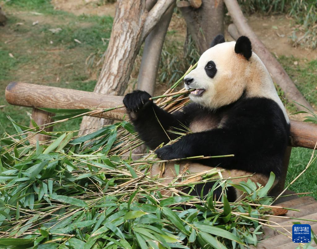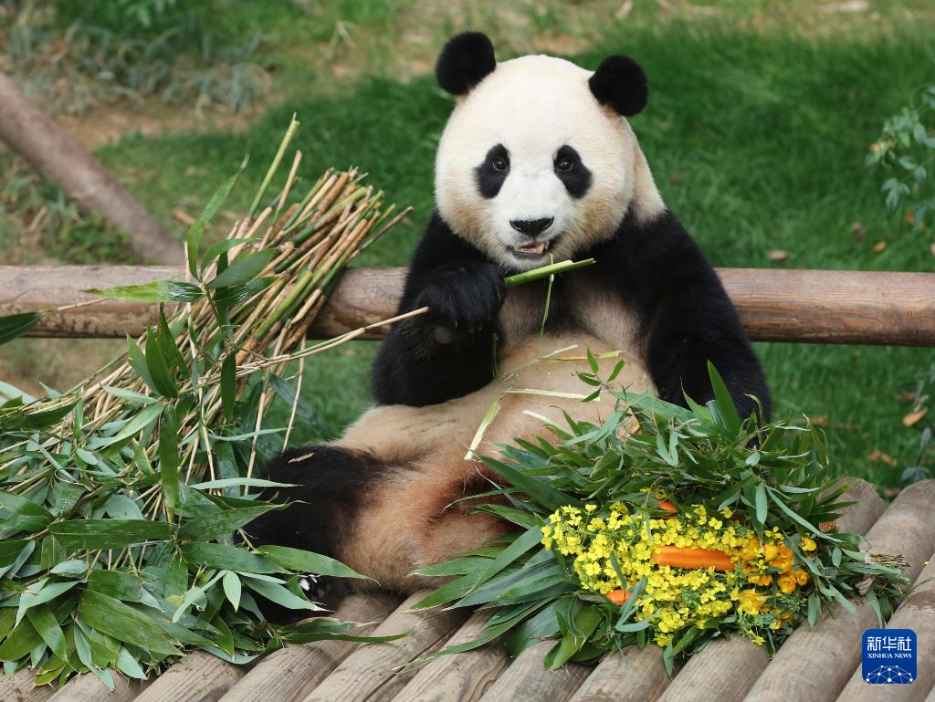 3月3日,大熊猫“福宝”在位于韩国京畿道龙仁市的爱宝乐园享用美食。