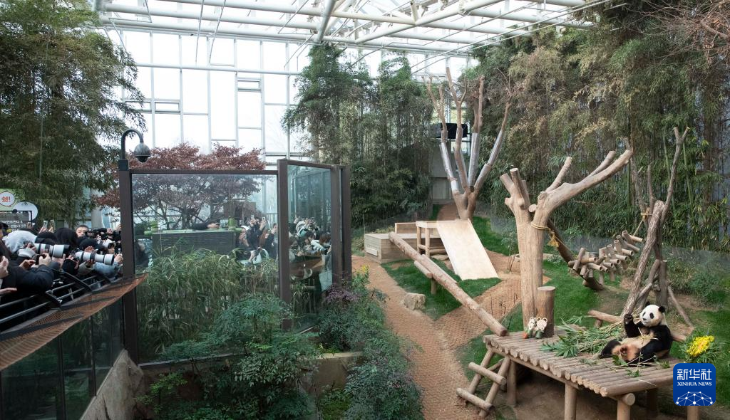 3月3日,人们在位于韩国京畿道龙仁市的爱宝乐园观看大熊猫“福宝”。