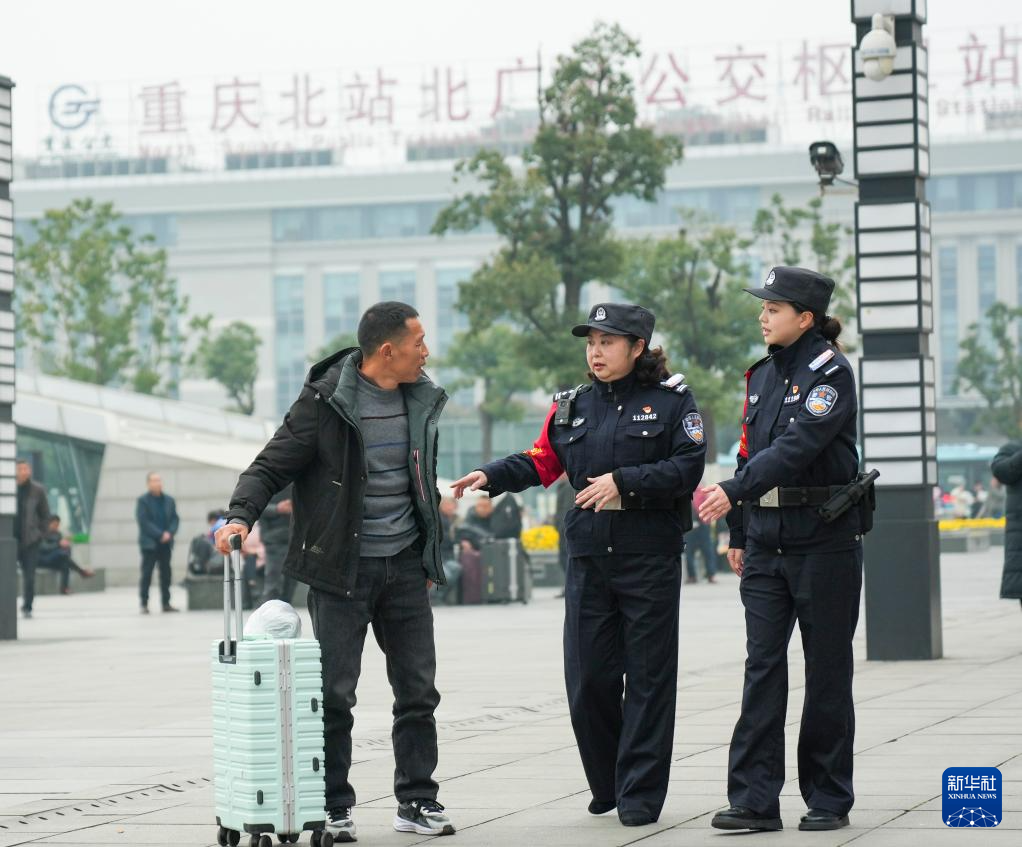 3月4日,在重庆北站候车室,巡逻中的梁尚秋(右一)和胡航婕(左一)为旅客提供咨询服务。