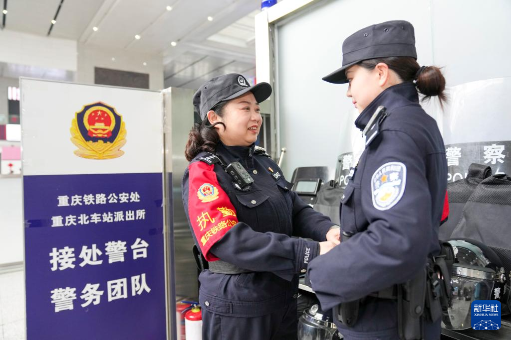 3月4日,在重庆北站的接处警台备勤区,梁尚秋(左)给自己的徒弟胡航婕检查出警装备。