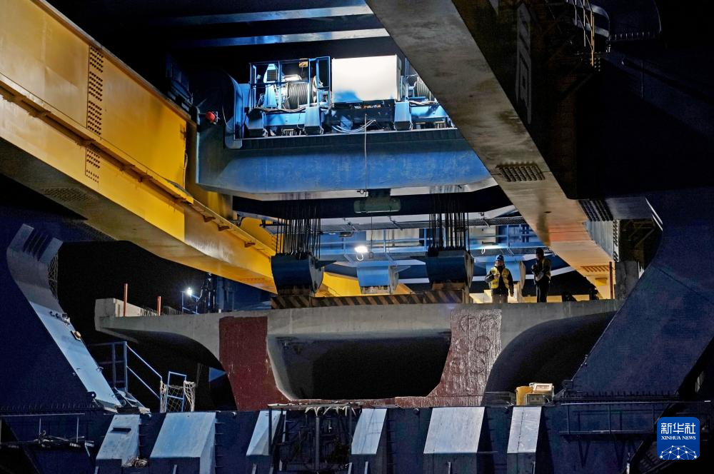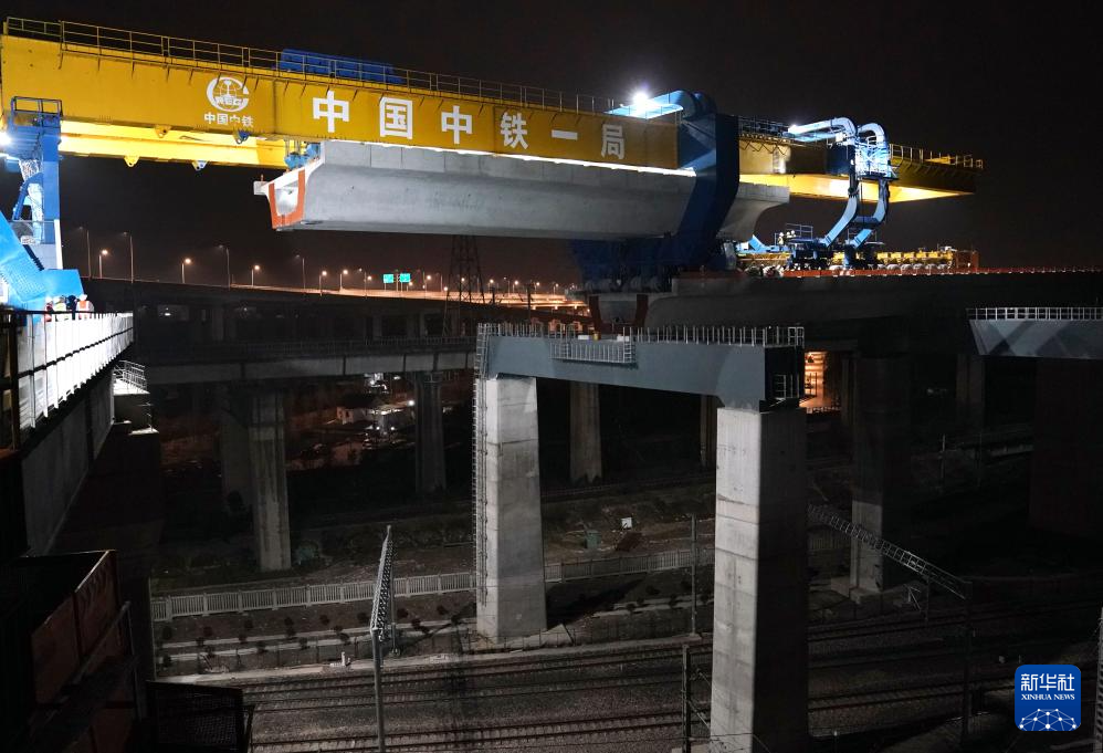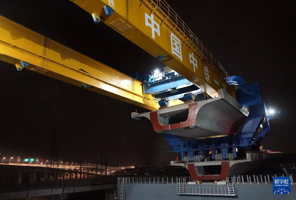 3月4日凌晨拍摄的沪苏湖铁路全线最后一榀箱梁架设施工现场。