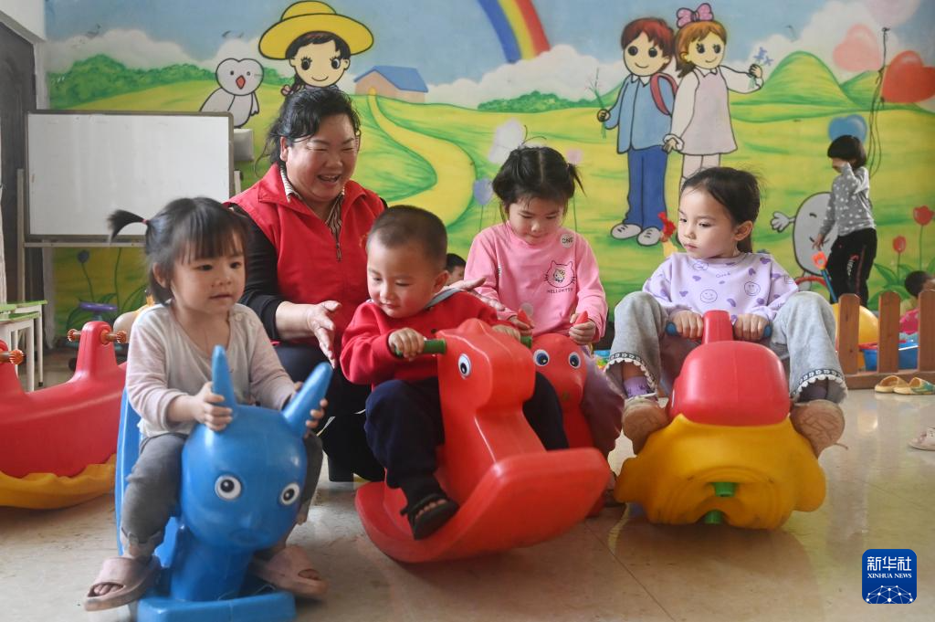 在广西宾阳县中华镇的一个“留守儿童之家”,张清秀和孩子们玩耍(3月5日摄)。