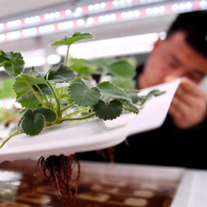 3月8日,馆陶县一家现代农业示范园区的工作人员在智能温室内查看水培草莓生长情况。