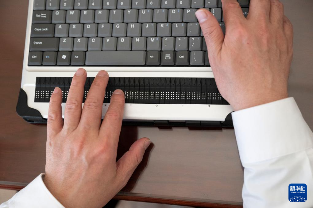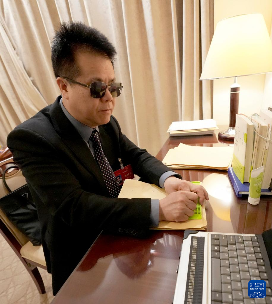 3月3日,王永澄代表在北京的驻地房间里展示他的盲文笔记本电脑。该电脑没有显示屏,上部是普通键盘,下部是可刷新的盲文显示器,视障人士可以通过用手触摸来获得信息。