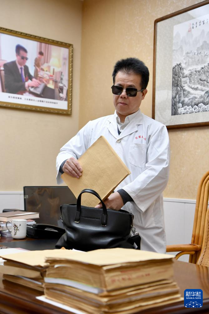 2月6日,王永澄代表在福建省海峡盲人按摩指导中心的工作室整理盲文建议材料。