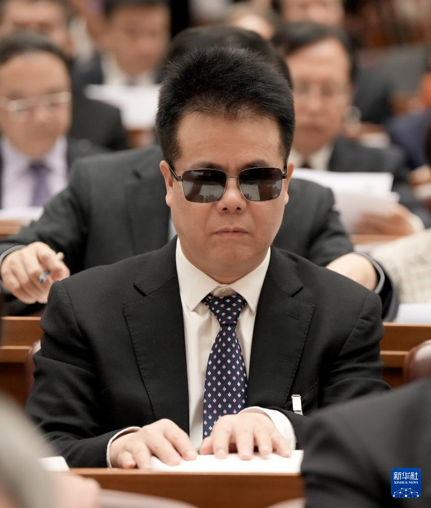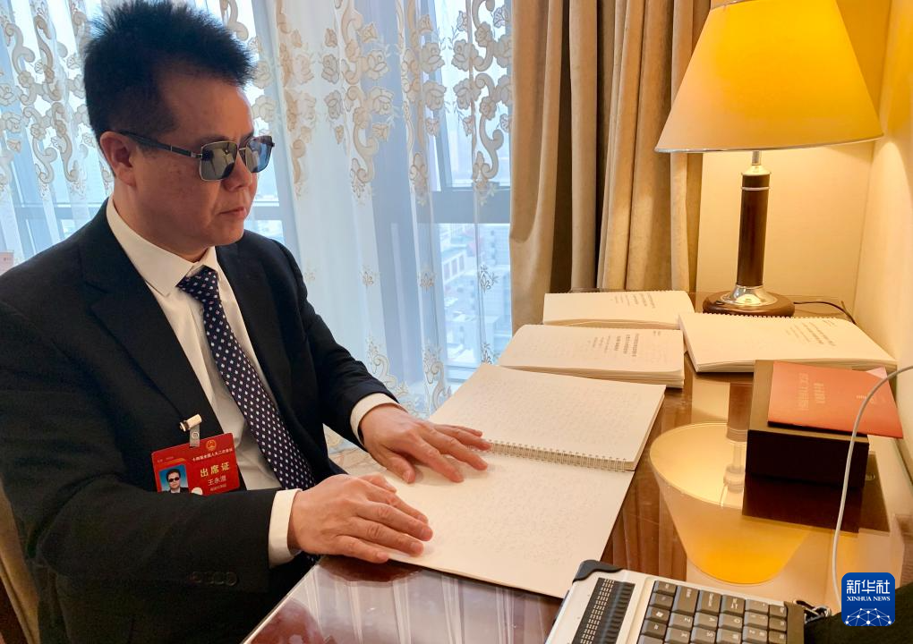3月5日,在十四届全国人大二次会议开幕会上,王永澄代表用手指阅读盲文版的政府工作报告。