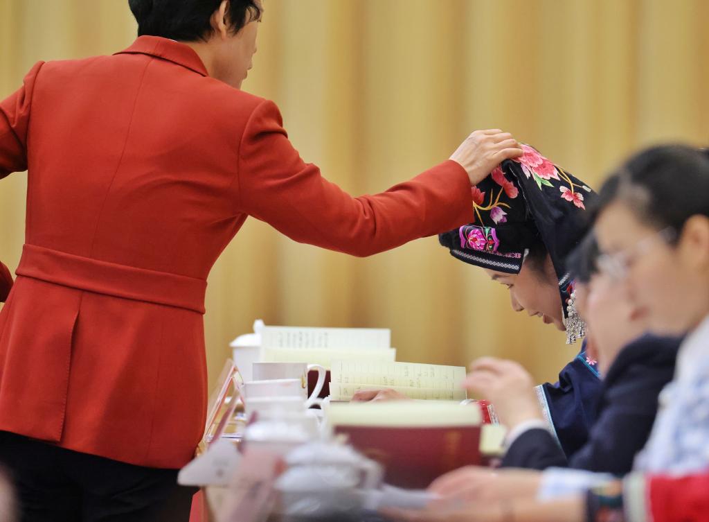 3月6日,在十四届全国人大二次会议贵州代表团全体会议会中休息时,一位代表与李利交谈,伸手感受民族服饰的质地。