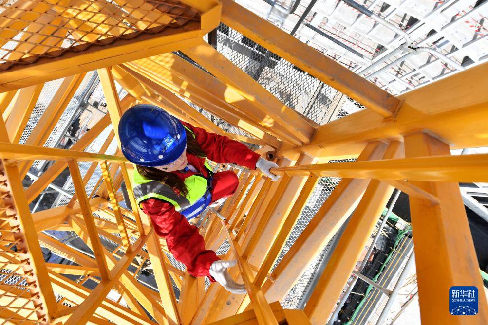 3月6日,在中建三局兰州大学榆中校区项目建设工地,王甜甜在攀爬塔吊准备作业。