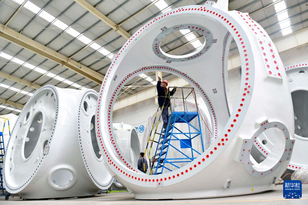 3月1日,在滨州市惠民经济开发区风电装备制造产业园涂装车间,工人在涂装风电轮毂。