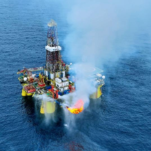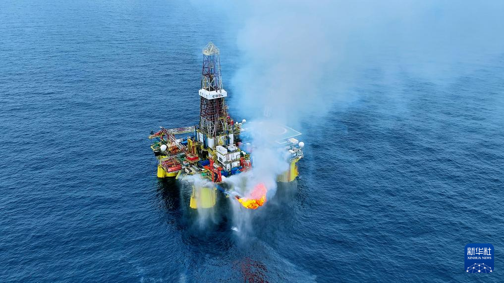 “南海八号”钻井平台在开平南油田探井进行产量测试(2023年4月30日摄)。